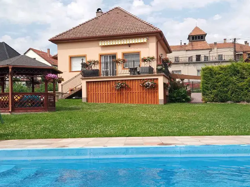 Balatonfűzfő. Das Ferienhaus befindet sich auf einem 860 qm großen, geschlossenen Gartengrundstück mit Wiese, Blumen, Sträuchern und Bäumen, von einem Zaun begrenzt. Der Vermieter wohnt nicht im Haus oder auf dem Grundstück. Die Zufahrt erfolgt über eine Nebenstraße (asphaltiert). Parkplatz (für 3 Pkws) auf dem Grundstück. Automatische Türen und automatisches Garagentor Ansatz.